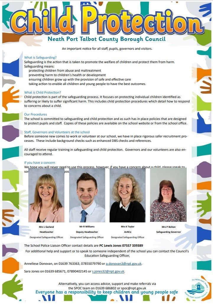We endeavour to provide a safe and welcoming environment where all children are respected and valued. We recognise and act upon our moral and statutory responsibility to safeguard and promote the welfare of pupils. If you have any concerns, please speak to Mrs L. Garland (Designated Child Protection Officer), Mr R. Williams (Deputy Designated Child Protection Officer), or Mrs K. Taylor (Deputy Designated Child Protection Officer). Our Safeguarding Governor is Mrs Philippa Bolton. For further guidance you can visit: www.nspcc.org.uk or www.schoolbeat.org.